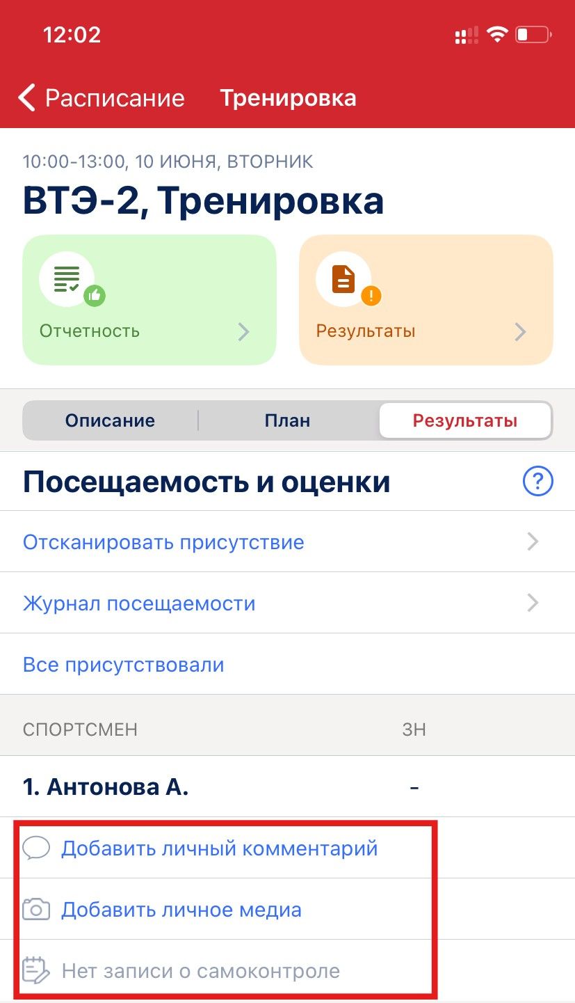 Также в данном разделе можно посмотреть, оставил ли спортсмен запись в Дневнике самоконтроля и приложил ли свой медиафайл для тренера (отчёт о самоподготовке).