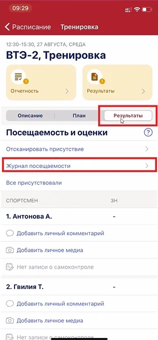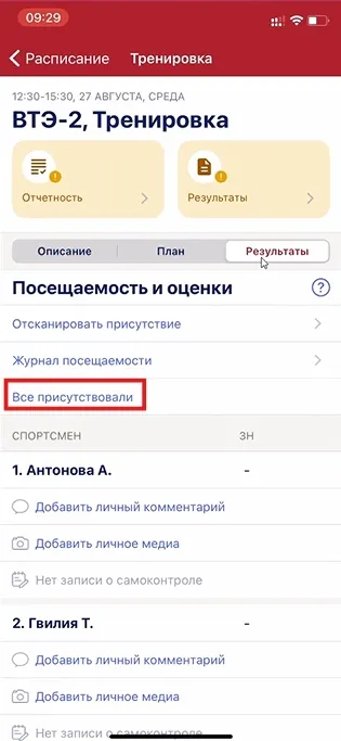 Чтобы воспользоваться этой функцией в мобильном приложении, необходимо перейти в раздел «Результаты» конкретной тренировки и нажать кнопку «Все присутствовали».