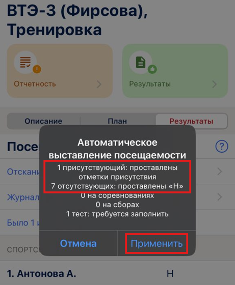 После нажатия этой кнопки присутствующим спортсменам будут проставлены отметки о присутствии, а отсутствующим – «Н».