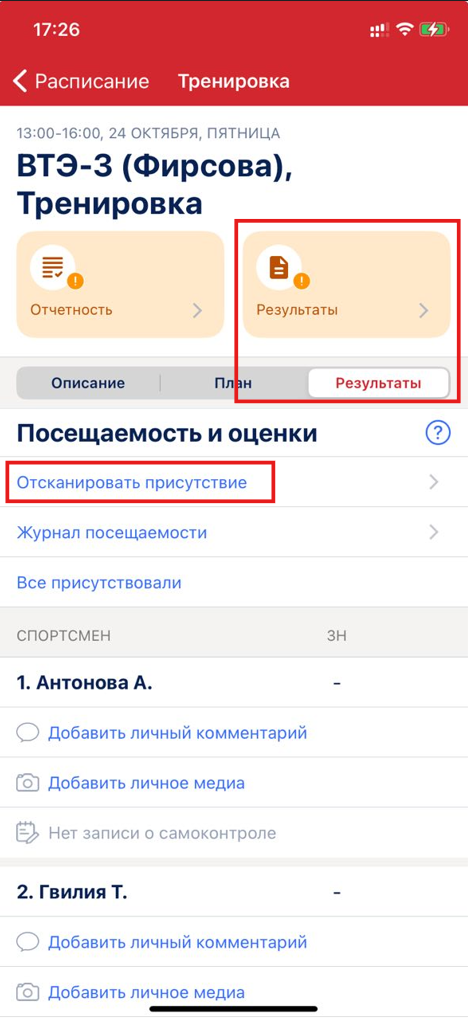 Чтобы отсканировать присутствие спортсмена на тренировке, необходимо выполнить следующие действия: