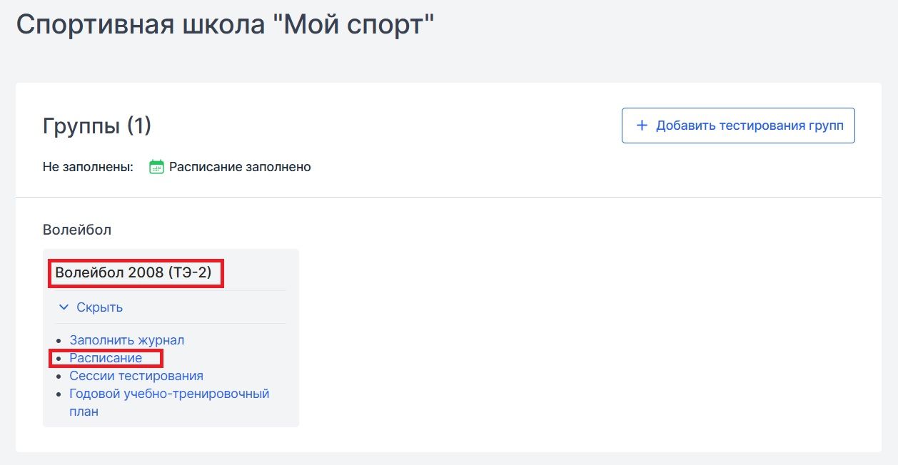 Для того чтобы перейти в расписание группы, необходимо нажать на название группы или на кнопку «Расписание».