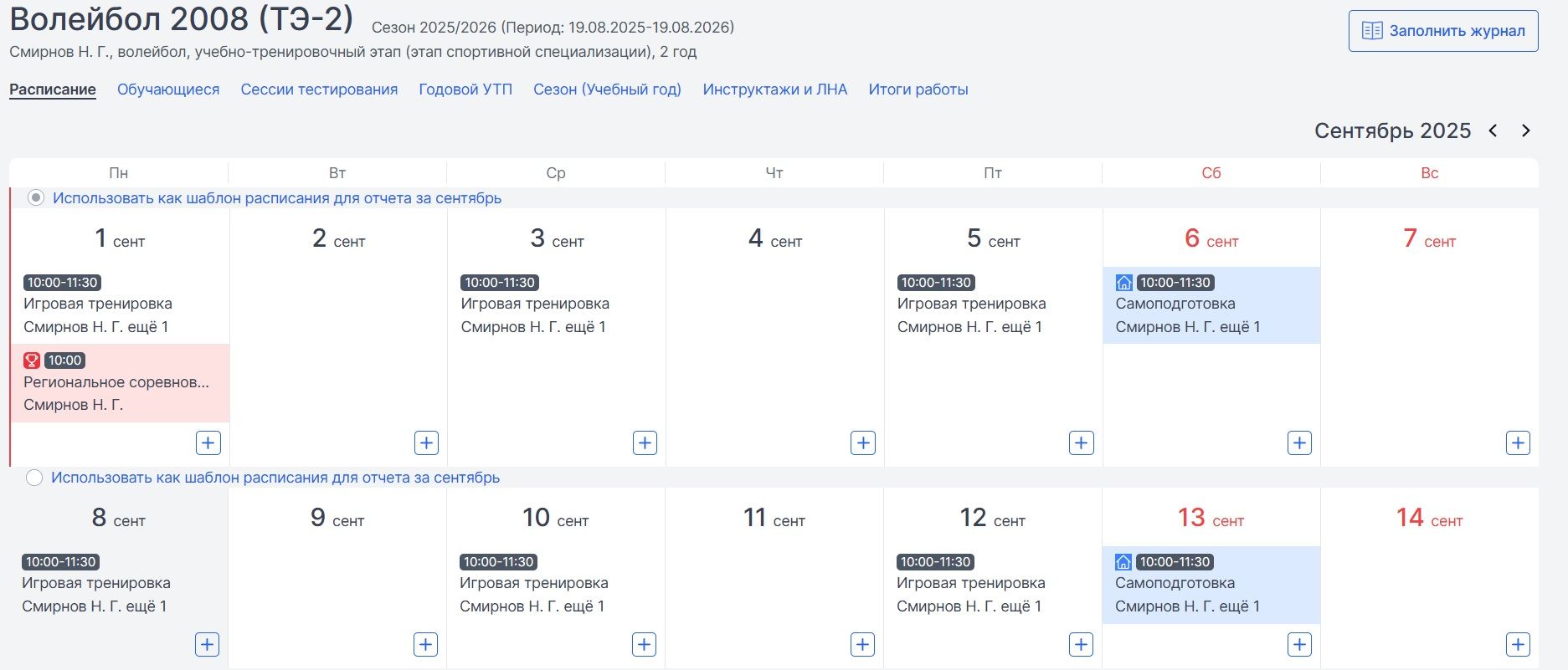 На странице «Расписание» отображаются тренировки, самоподготовка, соревнования и неучебное время. По умолчанию отобразится текущий месяц. Если нужные тренировки не отображаются, то необходимо обратиться к администратору системы в Вашей спортивной школе для их добавления.