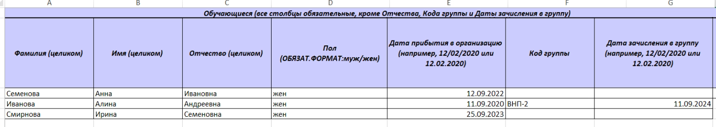 • поля «Код группы» и «Дата зачисления в группу» не являются обязательными, но если группы в системе уже созданы, то данные поля можно заполнить, чтобы сразу зачислить спортсменов в группу. Код группы (название группы), указываемый в шаблоне, должен совпадать с существующим кодом группы в системе;