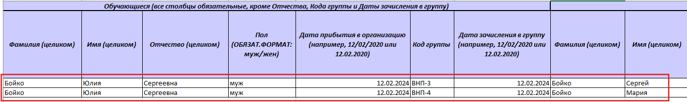 • вносите данные обучающегося и родителя/законного представителя на одной строке;