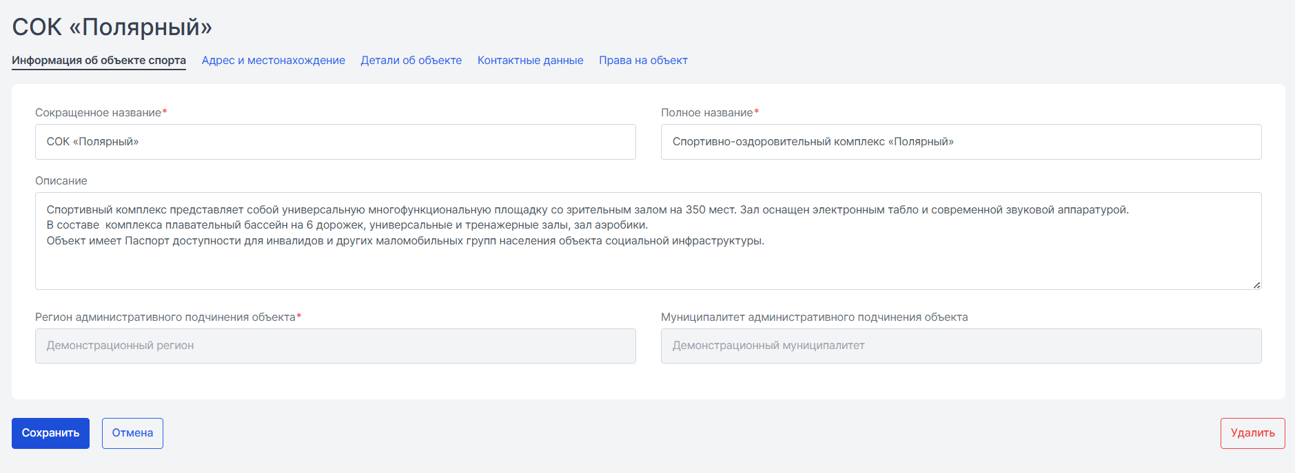 При удалении объекта информация полностью пропадет из реестра. Восстановление удаленного объекта невозможно. Если объект ранее использовался спортивной организацией, то у нее данный объект сохранится, как добавленный локально.