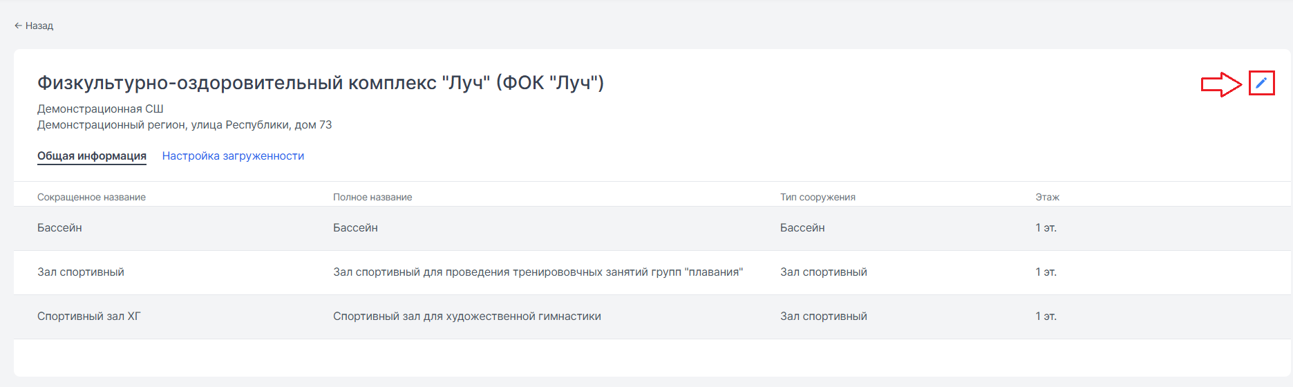 - Обязательно проверьте, что все данные в карточке объекта заполнены. Перейти к редактированию объекта спорта или места в объекте можно по клику на синий карандаш. Проверьте, что добавлено описание объекта и указаны верные координаты. Если объект имеет паспорт доступности для инвалидов и других маломобильных групп населения объекта социальной инфраструктуры рекомендуем указать эту информацию в кратком описании объекта.