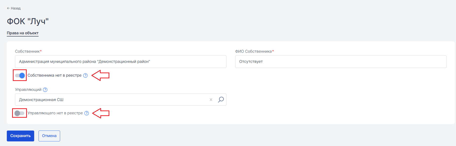 После изменения собственника необходимо обязательно нажать на кнопку «Сохранить» и обновить страницу. Если выбран собственник не из реестра, то у региона/муниципалитета появится возможность корректировать информацию об объекте.